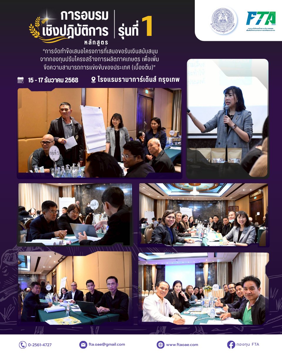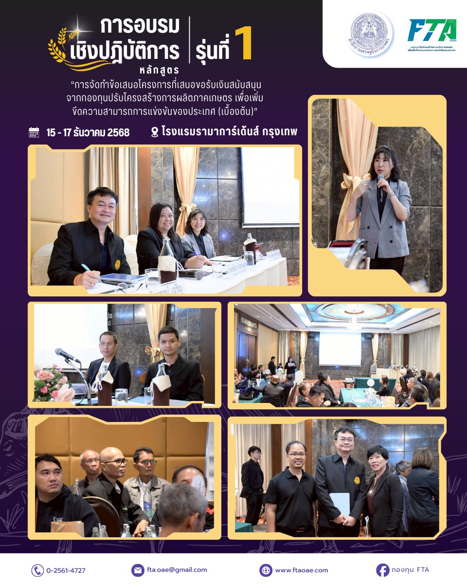 เมื่อวันจันทร์ที่ 15 ธันวาคม 2568 กองทุนปรับโครงสร้างการผลิตภาคเกษตรฯ จัดการอบรมเชิงปฏิบัติการ รุ่นที่ 1 หลักสูตร “การจัดทำข้อเสนอโครงการที่เสนอขอรับเงินสนับสนุนจากกองทุนปรับโครงสร้างการผลิตภาคเกษตรเพื่อเพิ่มขีดความสามารถการแข่งขันของประเทศ (เบื้องต้น)” ระหว่างวันที่ 15 - 17 ธันวาคม 2568 ณ โรงแรมรามาการ์เด้นส์ กรุงเทพ จังหวัดกรุงเทพมหานคร โดยมี นายเอกราช ตรีลพ ผู้อำนวยการสำนักวิจัยเศรษฐกิจการเกษตร สำนักงานเศรษฐกิจการเกษตร เป็นประธานในพิธีเปิดการอบรม และมีกิจกรรมการอบรม ดังนี้ 📝การบรรยาย เรื่อง “ความรู้ทั่วไปเกี่ยวกับการเปิดเขตการค้าเสรี” โดย นายอกนิษฐ์ กิ่งศักดิ์ นักวิเคราะห์นโยบายและแผนชำนาญการ กองเศรษฐกิจการเกษตรระหว่างประเทศ สำนักงานเศรษฐกิจการเกษตร 📝การเสวนา เรื่อง “ถ่ายทอดประสบการณ์ขอรับเงินสนับสนุนโครงการนำร่องต้นแบบการผลิตถั่วเหลืองตามมาตรฐานเกษตรอินทรีย์สากลและแฟร์เทรด“ โดย นายสิทธิพงศ์ ศรีสว่างวงศ์ ผู้อำนวยการศูนย์วิจัยและเมล็ดพันธุ์พืชขอนแก่น กรมวิชาการเกษตร, พล.ต.หญิง นันท์มนัส ธำมรงค์รัตน์ ที่ปรึกษากลุ่มวิสาหกิจชุมชนเกษตรอินทรีย์แฟร์เทรดศรีสะเกษ จังหวัดศรีสะเกษ และนางสุจินต์ คำผง เลขานุการวิสาหกิจชุมชนเกษตรอินทรีย์แฟร์เทรดศรีสะเกษ จังหวัดศรีสะเกษ มีนางสาวสุดารินทร์ รอดมณี เศรษฐกรชำนาญการพิเศษ เป็นผู้ดำเนินรายการ 📝การบรรยาย เรื่อง “ กรอบหลักเกณฑ์ วิธีการ ขั้นตอน และการถ่ายทอดประสบการณ์จริงการขอรับเงินสนับสนุนจากกองทุน FTA” โดย นายเอกราช ตรีลพ ผู้อำนวยการ สำนักวิจัยเศรษฐกิจการเกษตร สำนักงานเศรษฐกิจการเกษตร 📝บรรยาย อภิปราย และแบ่งกลุ่มปฏิบัติ ในหัวข้อ “รู้จักโครงการ” การวางแผนโครงการ การกำหนดแนวคิดโครงการ ข้อเสนอโครงการ โดย ผศ.ดร.พนามาศ ตรีวรรณกุล มหาวิทยาลัยเกษตรศาสตร์ และนางสาวสายฝน ศรีสุธา สำนักพัฒนาการเรียนรู้ตลอดชีวิตมหาวิทยาลัยเกษตรศาสตร์ โดยมีเกษตรกรผู้ผ่านการคัดเลือกเข้าร่วมอบรม จำนวน 55 คน ซึ่งคาดว่าผู้ผ่านการอบรมมีความรู้ความเข้าใจเกี่ยวกับแนวทางการสนับสนุนเงินของกองทุนปรับโครงสร้างการผลิตภาคเกษตรเพื่อเพิ่มขีดความสามารถการแข่งขันของประเทศ สามารถจัดทำข้อเสนอโครงการที่เหมาะสมครบถ้วนสมบูรณ์ และได้รับการสนับสนุนเงินจากกองทุนฯ และ มีความรู้ความเข้าใจเกี่ยวกับเขตการค้าเสรี ตลอดจนผลกระทบที่เกิดขึ้นจากการทำข้อตกลงการค้าเสรีได้...