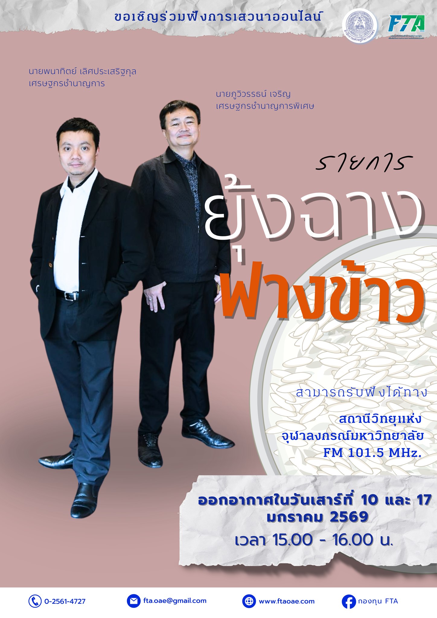 📆วันจันทร์ที่ 5 มกราคม 2569 กองทุน FTA โดย นายภูวิวรรธน์ เจริญ เศรษฐกรชำนาญการพิเศษ และ นายพนาทิตย์ เลิศประเสริฐกุล เศรษฐกรชำนาญการ ให้สัมภาษณ์ในรายการยุ้งฉาง ฟางข้าว ทางสถานีวิทยุจุฬาฯ FM 101.5 พิธีกรดำเนินรายการ ผศ. ดร.วริพัสย์ เจียมปัญญารัช สำนักวิชาทรัพยากรการเกษตร จุฬาลงกรณ์มหาวิทยาลัย ซึ่งเนื้อหาที่สัมภาษณ์ ประกอบด้วย หัวข้อ "FTA กับสินค้าเกษตรไทย" ออกอากาศ วันเสาร์ที่ 10 มกราคม 2569 เวลา 09.30 - 10.00 น. หัวข้อ "FTA กับสินค้าเกษตรไทย" ออกอากาศ วันเสาร์ที่ 17 มกราคม 2569 เวลา 09.30 - 10.00 น. 📻 โดยรับฟังรายการได้ทาง สถานีวิทยุแห่งจุฬาลงกรณ์มหาวิทยาลัย FM 101.5 MHz และช่องทางออนไลน์ของสถานี ร่วมเป็นกำลังใจให้กองทุน FTA ในการสนับสนุนเกษตรกรและภาคการเกษตรไทย ให้สามารถปรับตัวต่อการเปลี่ยนแปลงด้านการค้าเสรี 🌾...