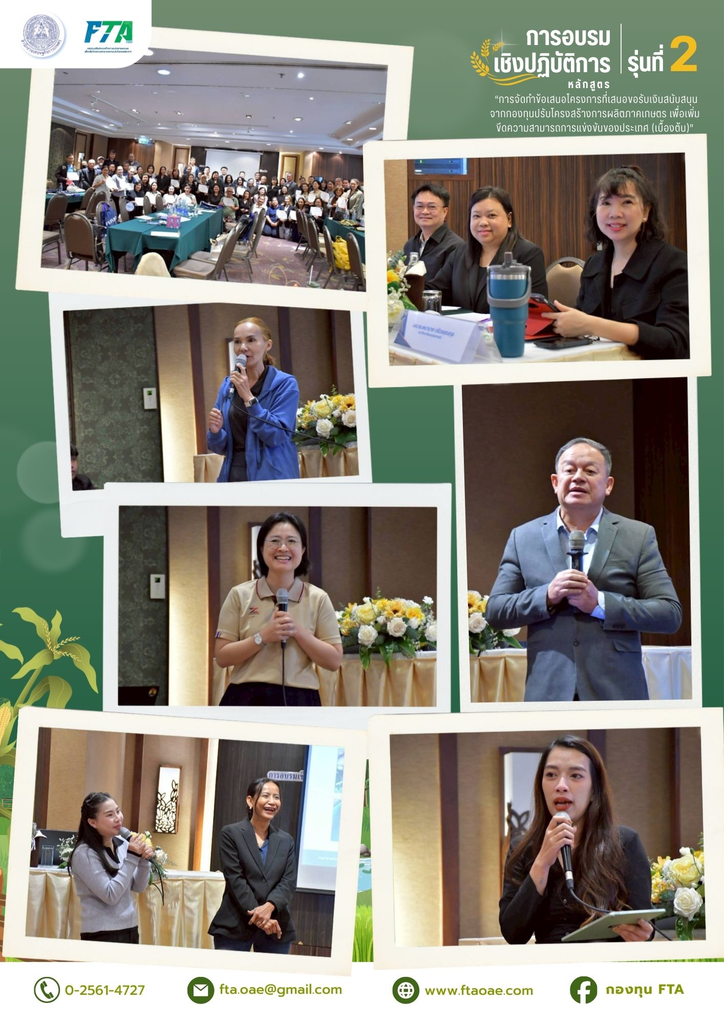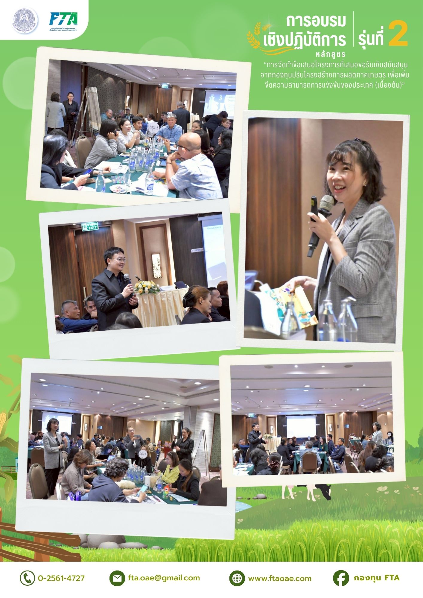 เมื่อวันศุกร์ที่ 23 มกราคม 2569 กองทุนปรับโครงสร้างการผลิตภาคเกษตรฯ จัดอบรมเชิงปฏิบัติการ รุ่นที่ 2 หลักสูตร “การจัดทำข้อเสนอโครงการที่เสนอขอรับเงินสนับสนุนจากกองทุนปรับโครงสร้างการผลิตภาคเกษตรเพื่อเพิ่มขีดความสามารถการแข่งขันของประเทศ (เบื้องต้น)” ระหว่างวันที่ 21 - 23 มกราคม 2569 ณ โรงแรมรามาการ์เด้นส์ กรุงเทพ จังหวัดกรุงเทพมหานคร โดยมีกิจกรรม ดังนี้ 📝 “ลงมือเขียนโครงการ” การเขียนและจัดทำข้อเสนอโครงการ การระบุแผนบริหารความเสี่ยง (แบ่งกลุ่มปฏิบัติการเขียนโครงการ) 📝 “กลั่นกรองโครงการ” แจ้งพิจารณา ความสอดคล้องและความพร้อม การคิดวิเคราะห์ความเป็นไปได้ของ โครงการ (แบ่งกลุ่มปฏิบัติการเขียนโครงการ) โดยผู้เข้าร่วมอบรม ได้ร่วมฝึกปฏิบัติการ “กลั่นกรองโครงการ” การพิจารณาความสอดคล้องและความพร้อม การวิเคราะห์ ความเป็นไปได้ของโครงการ (แบ่งกลุ่มนำเสนอพิจารณาโครงการ และให้ข้อเสนอแนะ) โดยมี ผศ.ดร.พนามาศ ตรีวรรณกุล มหาวิทยาลัยเกษตรศาสตร์ นางสาวอัจฉรา ไอยรากาญจนกุล ผู้อำนวยการส่วนบริหารกองทุนภาคเกษตร และนายภูวิวรรธน์ เจริญ เศรษฐกรชำนาญการพิเศษ เป็นวิทยากร ซึ่งคาดว่าผู้ผ่านการอบรมมีความรู้ความเข้าใจเกี่ยวกับแนวทางการสนับสนุนเงินของกองทุนปรับโครงสร้างการผลิตภาคเกษตรเพื่อเพิ่มขีดความสามารถการแข่งขันของประเทศ สามารถจัดทำข้อเสนอโครงการที่เหมาะสมครบถ้วนสมบูรณ์ และได้รับการสนับสนุนเงินจากกองทุนฯ และ มีความรู้ความเข้าใจเกี่ยวกับเขตการค้าเสรี ตลอดจนผลกระทบที่เกิดขึ้นจากการทำข้อตกลงการค้าเสรีได้...