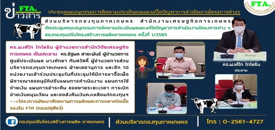 ดร.พงศ์ไท ไทโยธิน ผู้อำนวยการสำนักวิจัยเศรษฐกิจการเกษตร เป็นประธาน การประชุมคณะอนุกรรมการติดตามประเมินผลและแก้ไขปัญหาการดำเนินงานโครงการต่างๆครั้งที่ 1/2565
